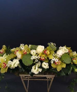 ARANJAMENTUL ESTE REALIZAT PE UN SUPORT DE BURETE UMED IN FORMA DE CRUCE AVAND LUNGIMEA DE 40 CM. CONTINE UN MIX DE FLORI ALBE. SE POATE ATASA SI UN MESAJ PE O BANDA SPECIALA DE DOLIU SAU PE O FELICITARE.